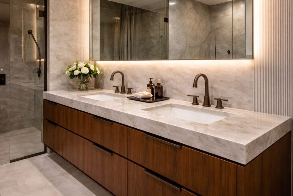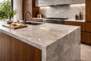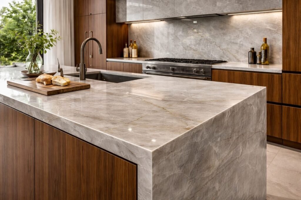 Its quartzite composition offers superior durability compared to marble while maintaining a refined, glass-like appearance that architects and designers love.