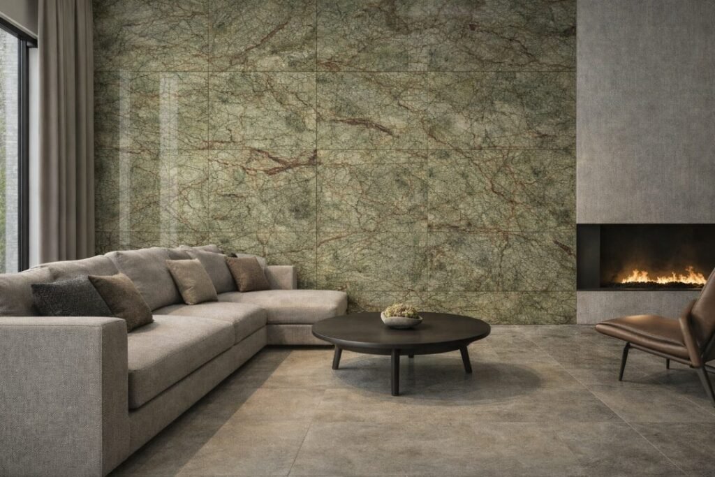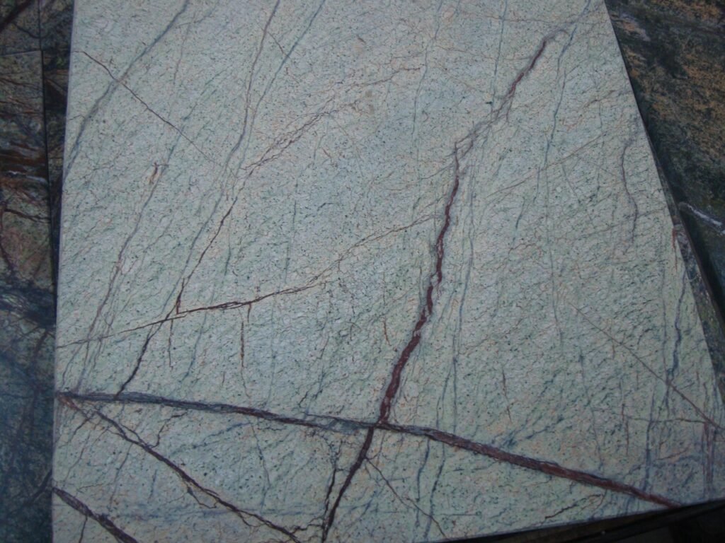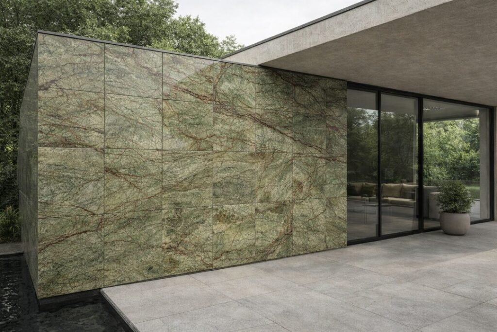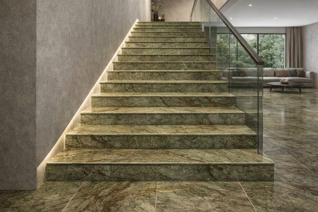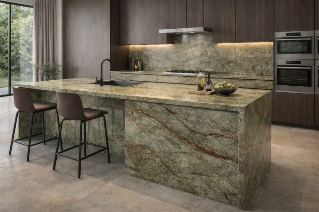 Rain Forest Green Marble is quarried in India and admired for its natural tree-branch patterns, earthy tones, and bold movement.