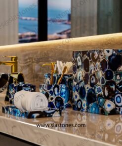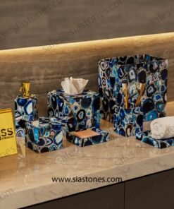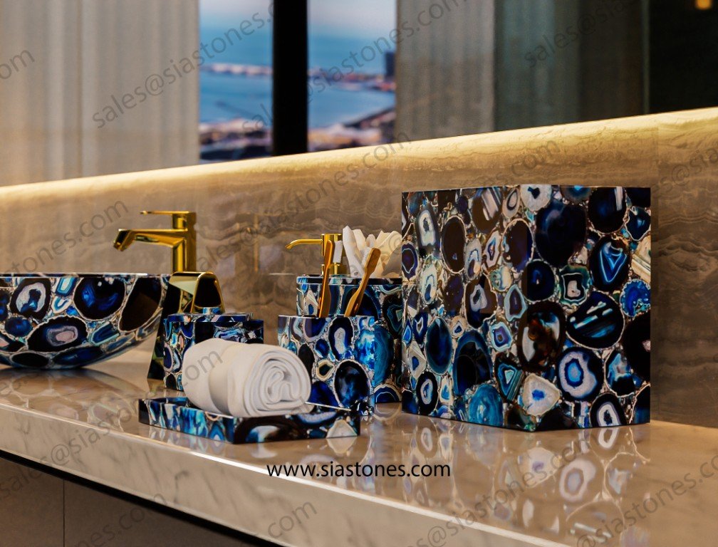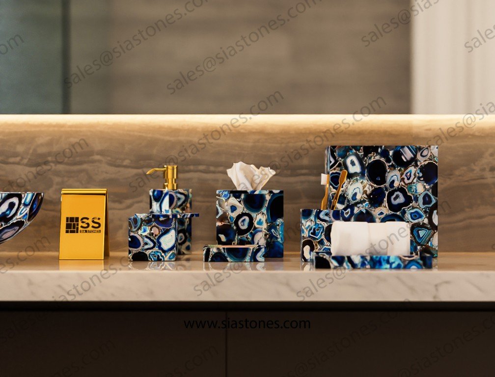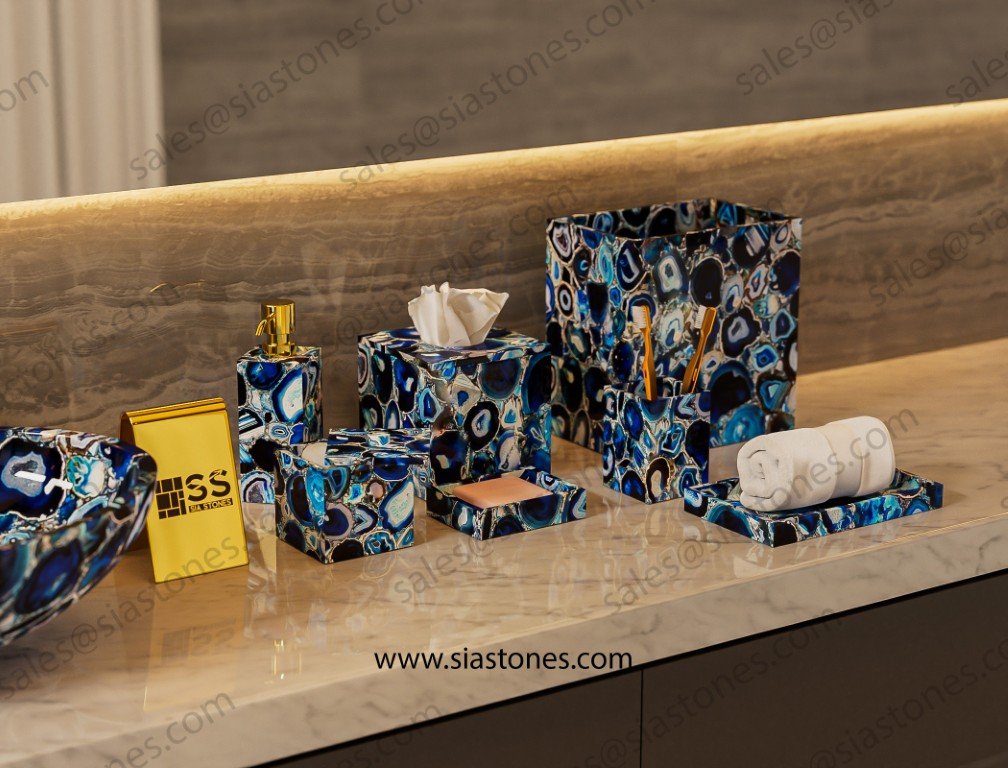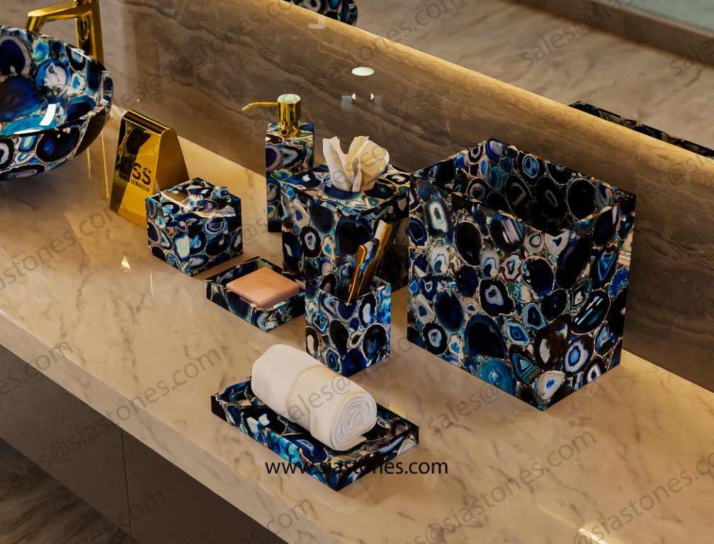 Make a bold statement in your bathroom with the rare elegance of blue agate. This luxury bathroom accessories set is a timeless investment in style.