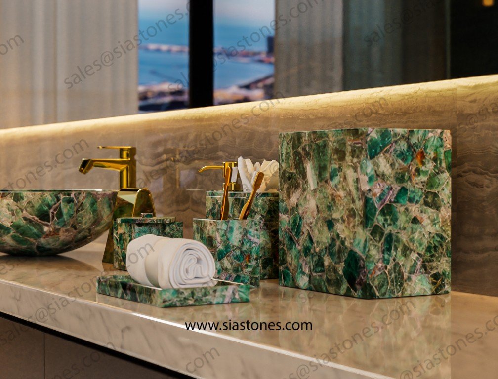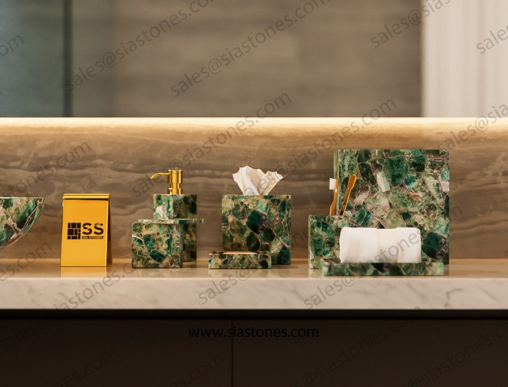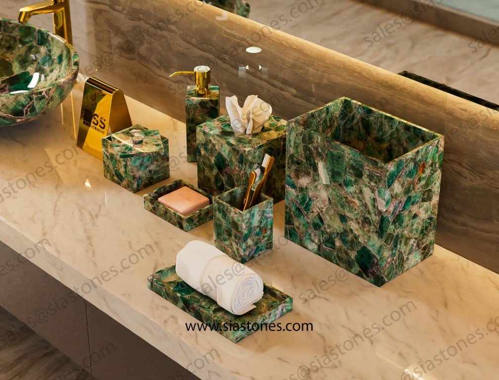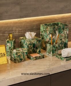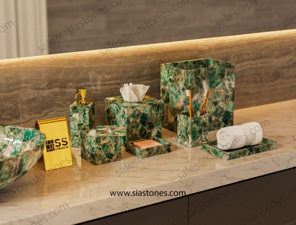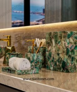 Each piece is unique, just like the stone it’s made from. If you’re looking for a bathroom set that stands out with elegance and style, the Emerald Green Fluorite Set is a perfect choice.