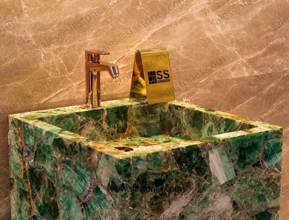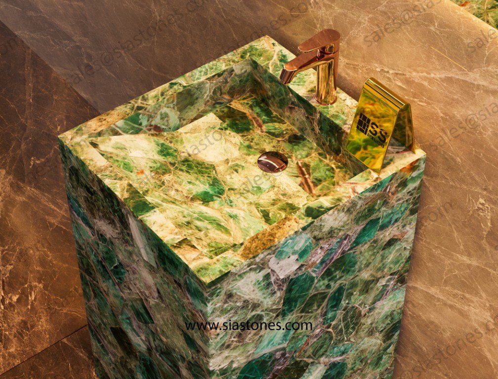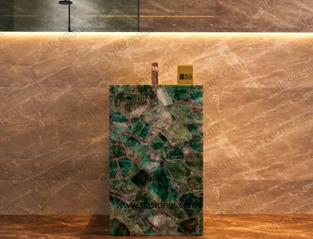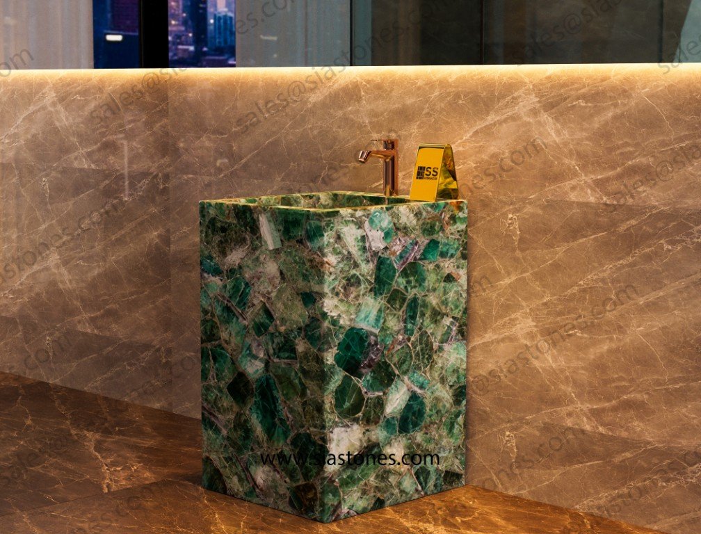 Transform your bathroom into a luxurious sanctuary with the Emerald Green Fluorite Pedestal Sink. Order now to bring timeless beauty and elegance to your space.