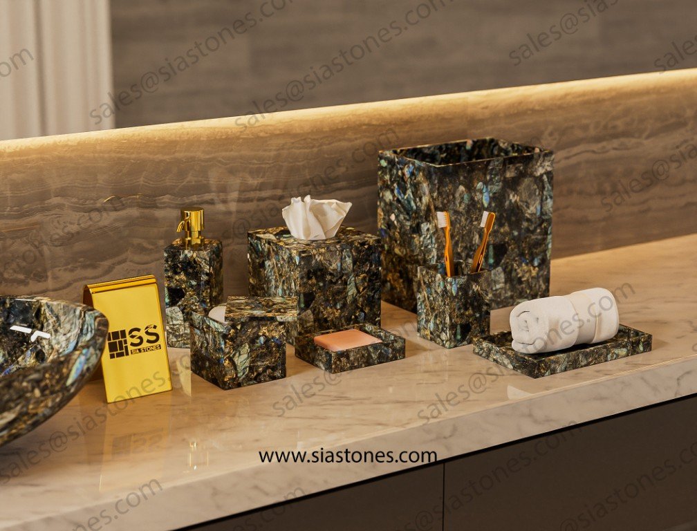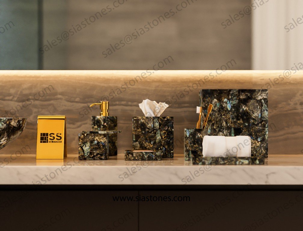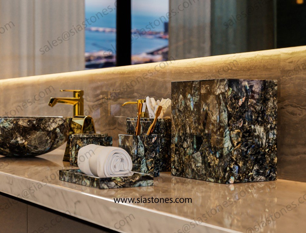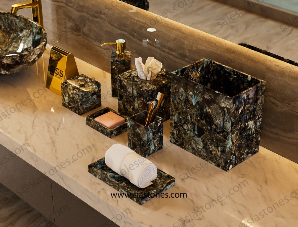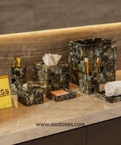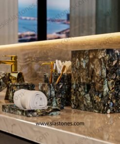 Each item is handcrafted by skilled artisans, ensuring that every piece reflects the unique qualities of the labradorite stone. The smooth, polished finish enhances the stone’s natural beauty, making it a perfect addition to any luxury bathroom, whether in private homes, hotels, or spas.
