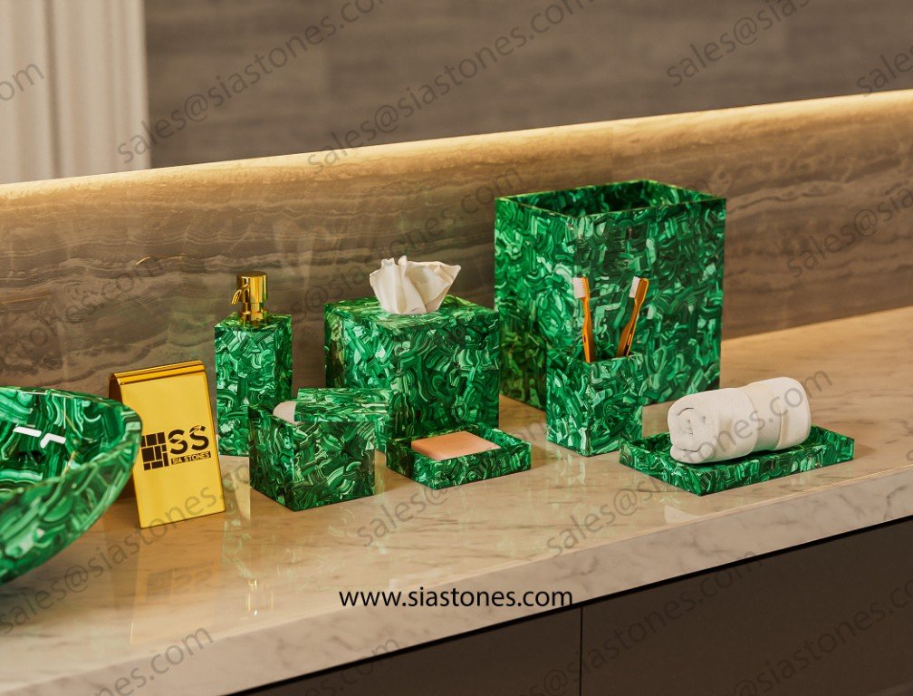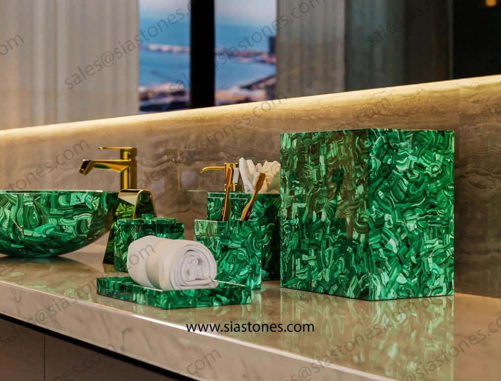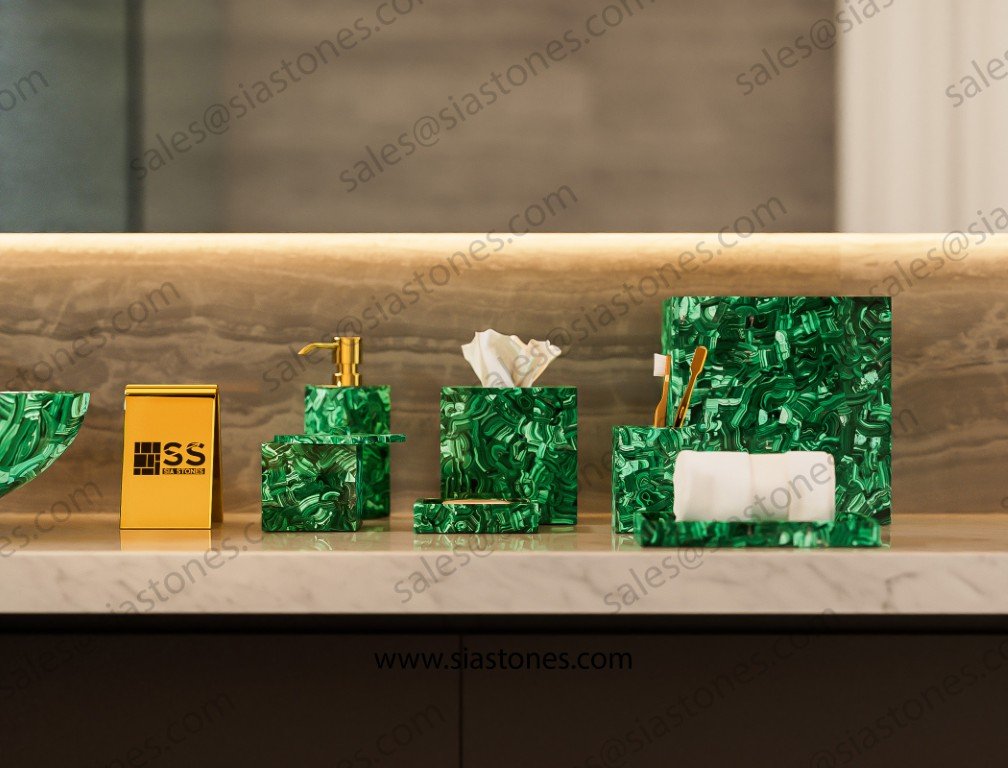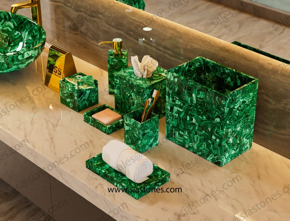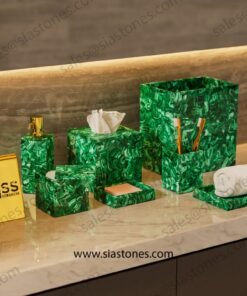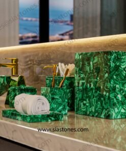 The Malachite Bath Accessories Set combines timeless beauty with functionality. The bold green hues of malachite create a focal point in your bathroom, while the smooth, polished finish adds sophistication and style. Ideal for luxury homes, upscale resorts, and high-end spas, this set is designed to elevate any bathroom with its stunning beauty and high-quality craftsmanship.