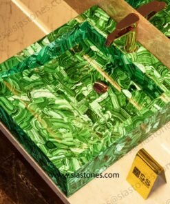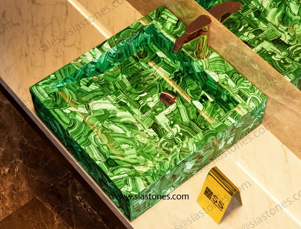 Enhance your bathroom with the Malachite Gemstone Square Sloped Wash Basin. Its luxurious green tones, distinctive patterns, and premium craftsmanship make it a timeless addition to any high-end space.