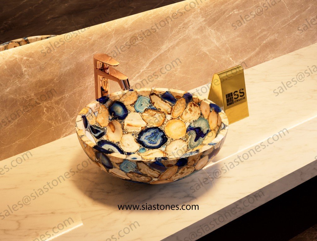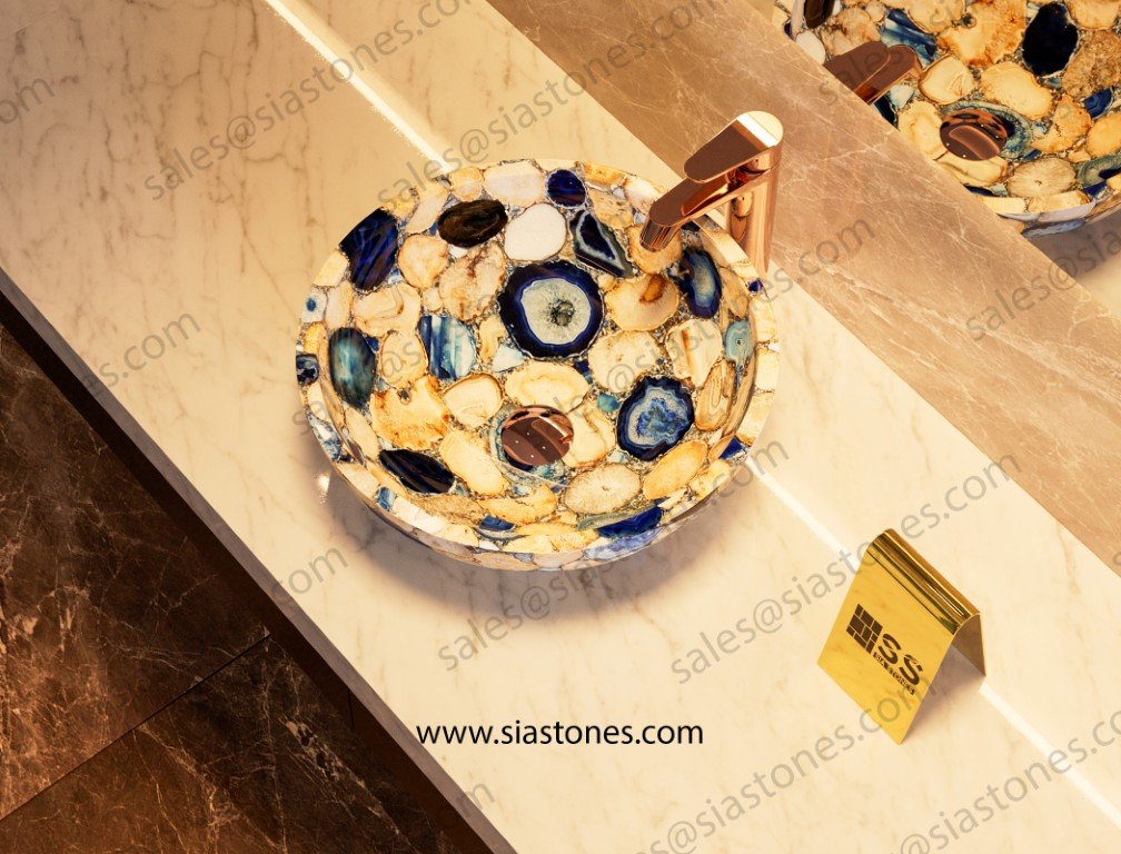 Each basin is handcrafted with care by skilled artisans, ensuring that no two pieces are alike. The natural variations in the agate stones make each basin a one-of-a-kind masterpiece, while its polished round design brings elegance to any bathroom, spa, or luxury hotel.