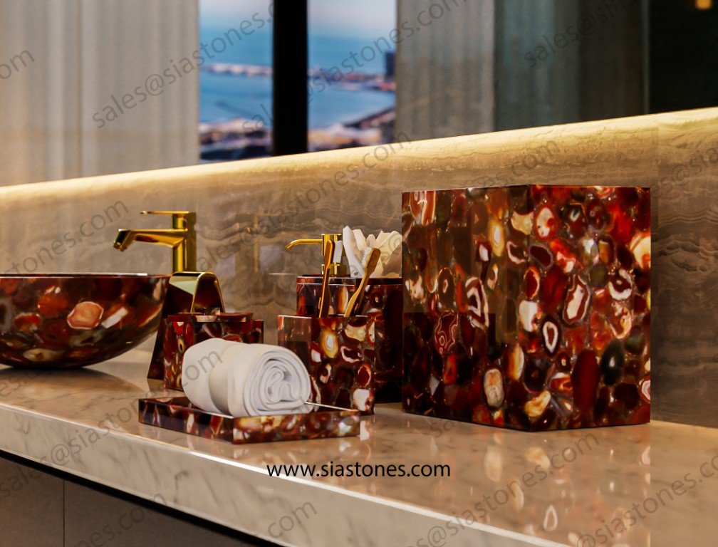 Perfect for luxury homes, premium hotels, spas, and designer bathrooms, this red gemstone set adds energy and richness to your interiors.