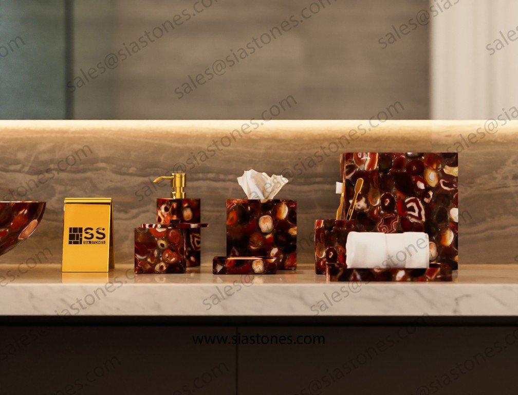 Make your bathroom look bold and beautiful with the Red Agate Bath Accessories Set. Made from authentic red agate gemstone, this 7-piece set brings powerful color, rich patterns, and high-end design into your space.