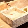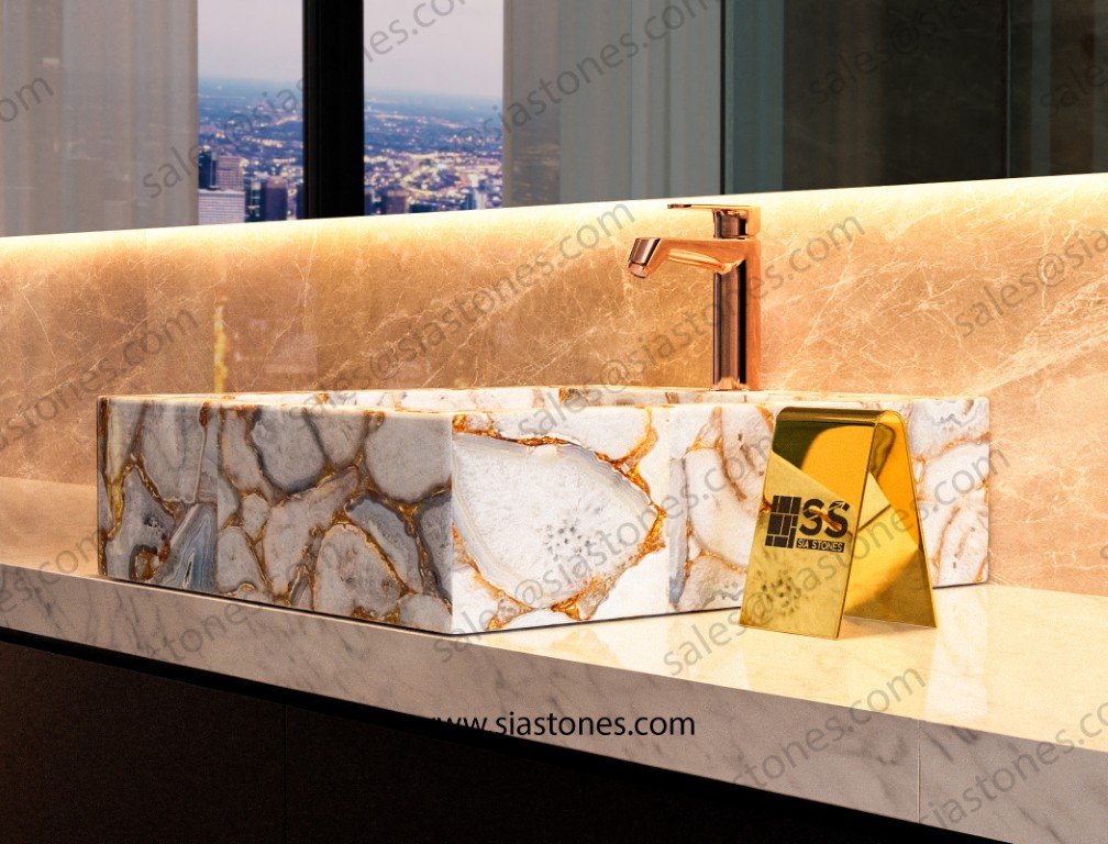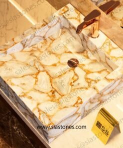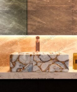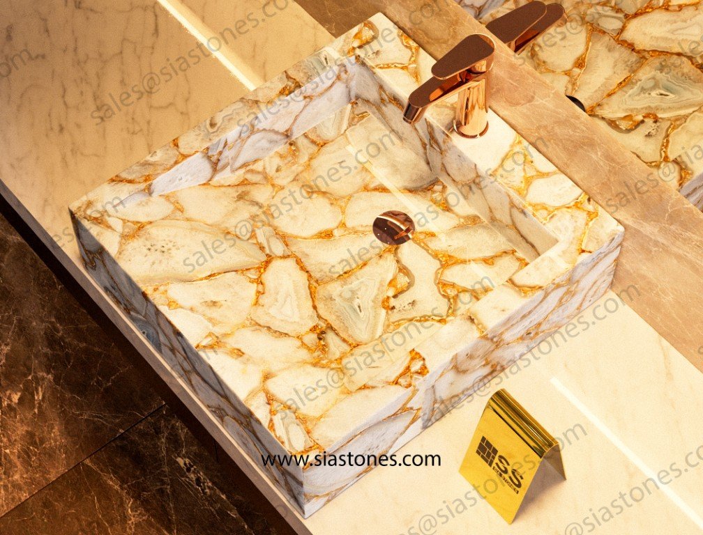 The White Agate Gold Fill Square Sloped Wash Basin brings an unmatched sense of luxury and sophistication to any bathroom. Its gold accents, premium craftsmanship, and durability make it the perfect choice for those seeking a unique and luxurious bathroom feature.