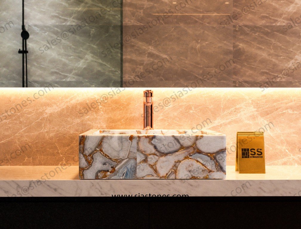 Handcrafted by skilled artisans, each basin is a true work of art. The white agate is complemented by a beautiful gold fill, offering a sophisticated and premium look. The durable agate stone ensures long-lasting use, while the smooth, easy-to-maintain surface guarantees effortless cleaning.